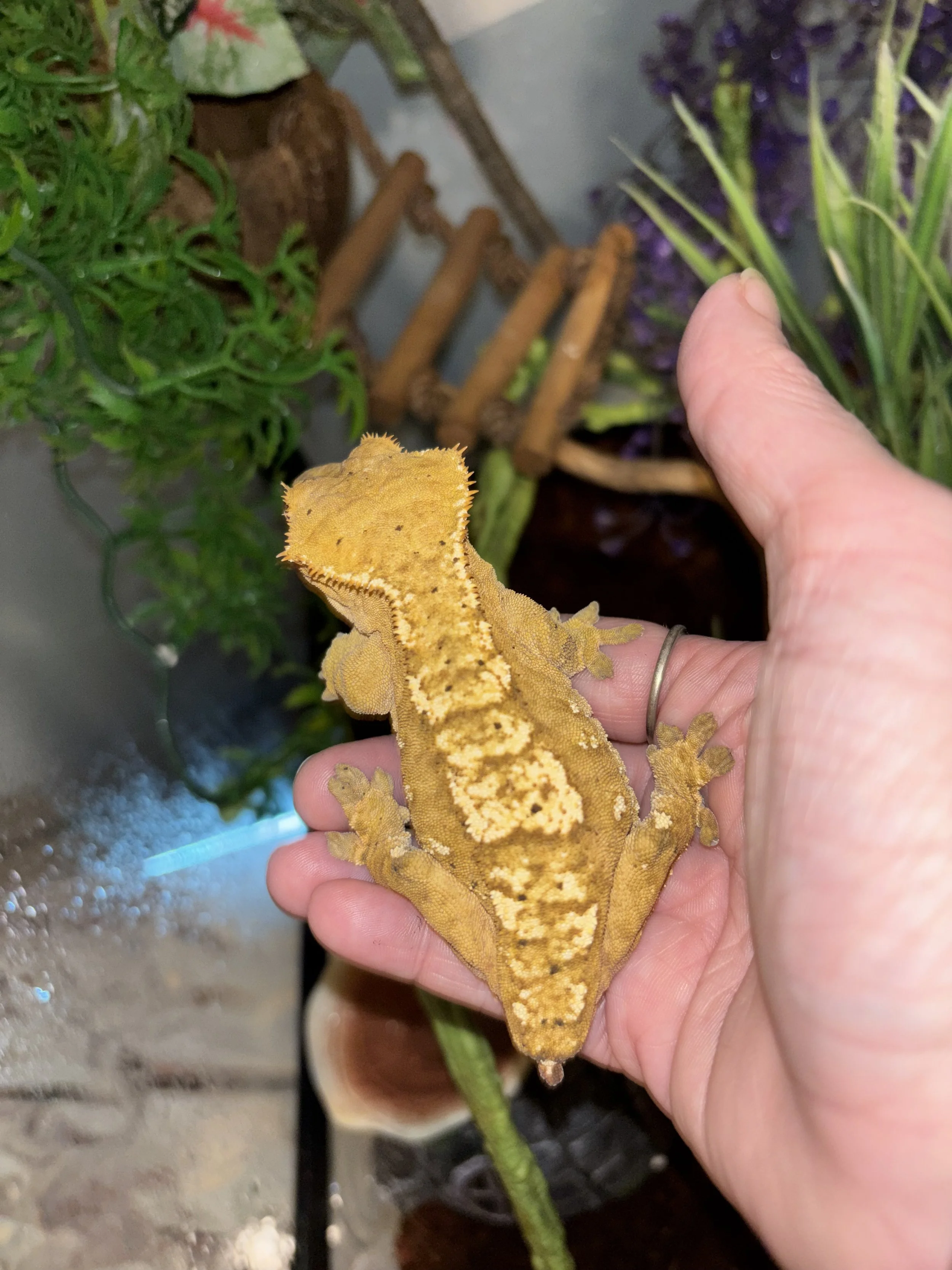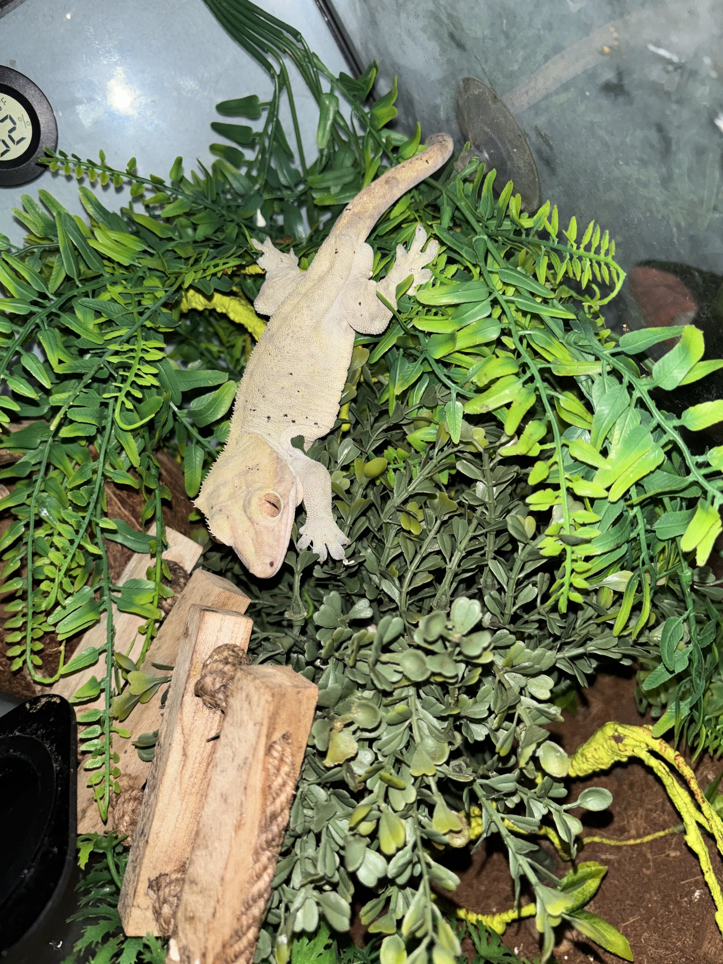 Meet Munchie, our current sire to the future generation of Olive Low Dalmatian Crested Geckos. He’s one of our first rescues that proved he had a lot of spunk in him. Estimated to be around 3 years old and in 100% health, Munchie’s green coloration and Dalmatian spots give him the best chance of winning hide and seek and keeping his winning streak. He’s very polite, eats very well, and seems to love trying to impress his new lady-friend, Scrunchie! Be prepared for a future of cuteness from these two!