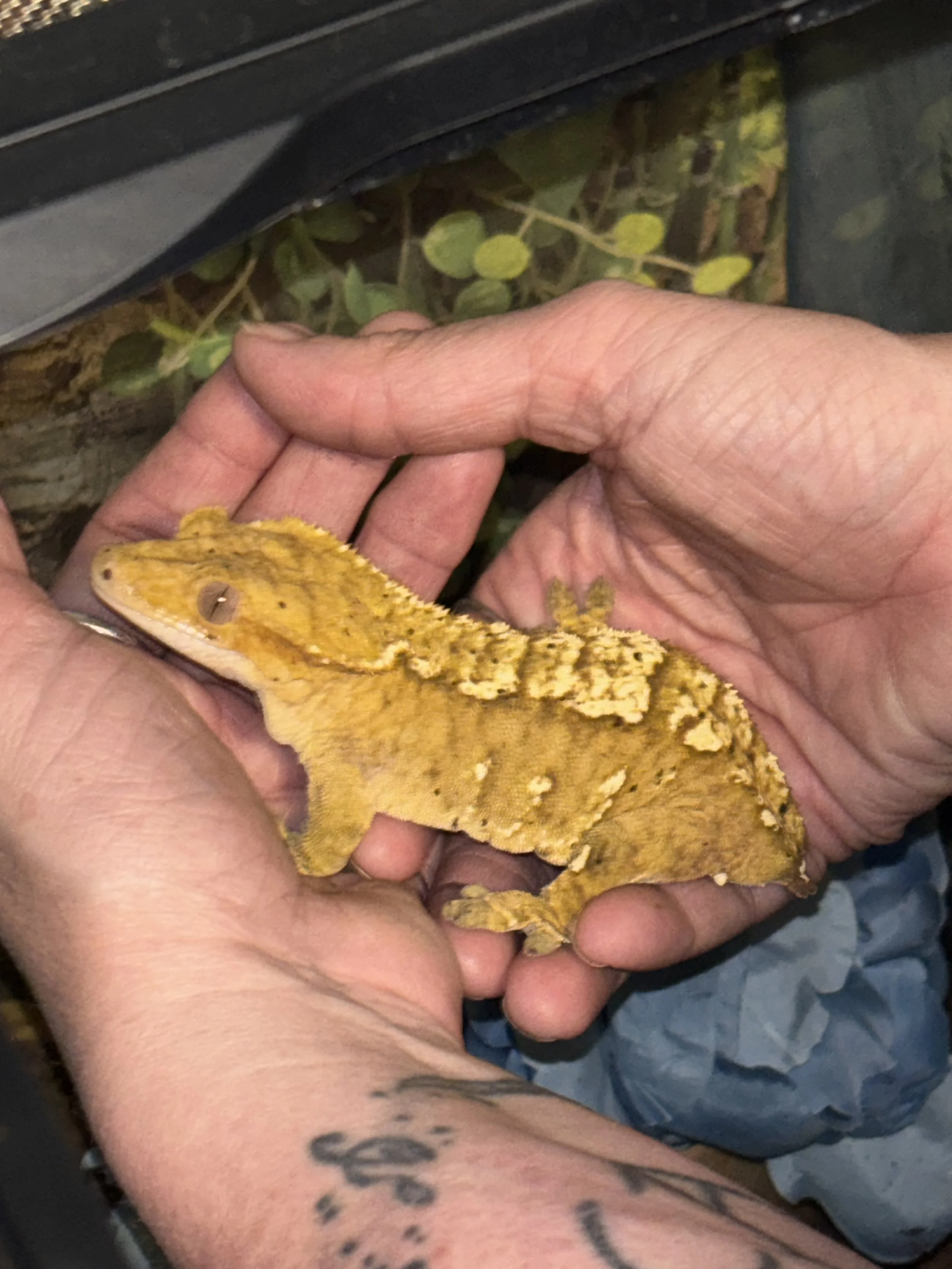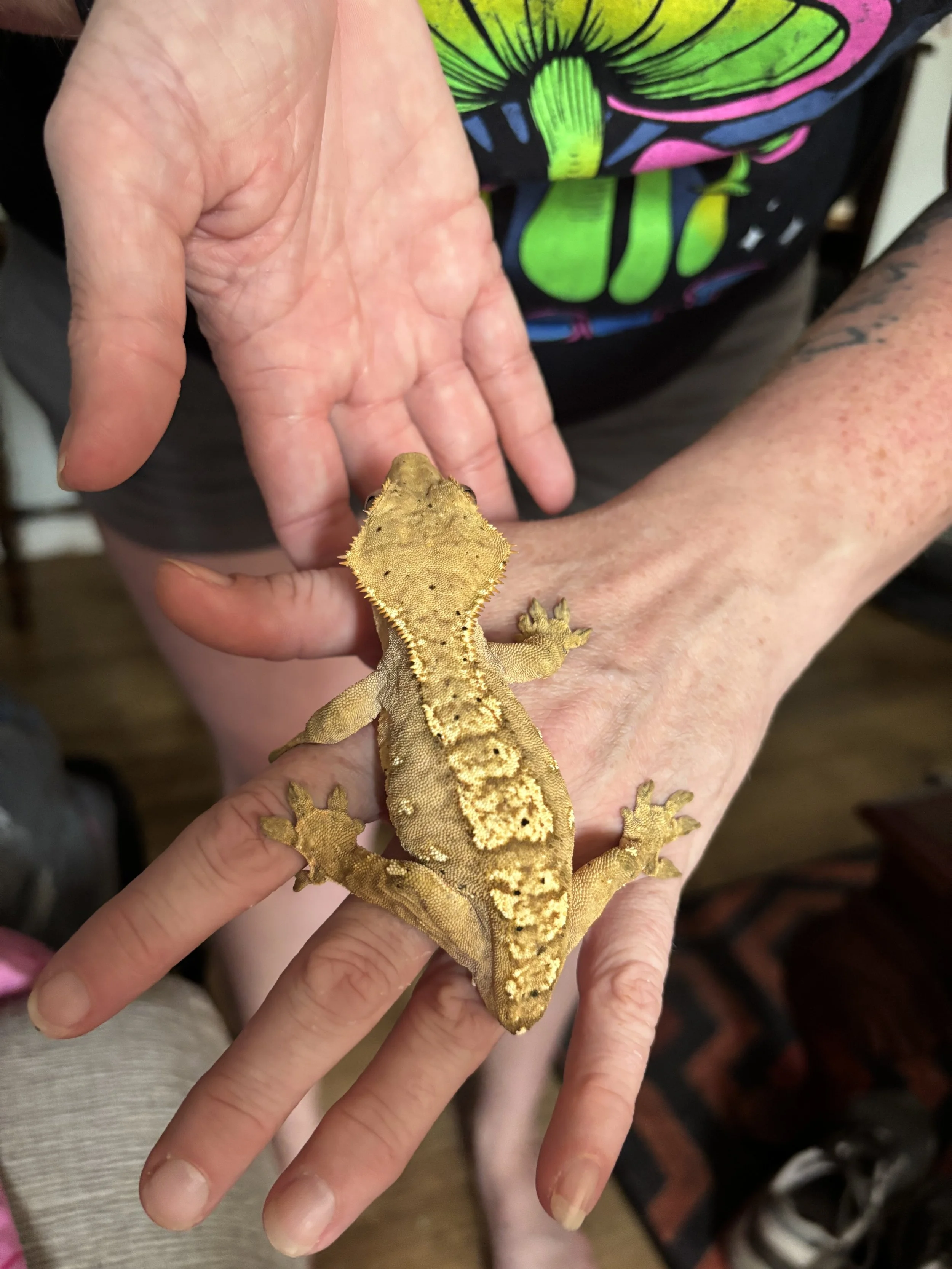 Meet Scrunchie, our female Yellow-Flame Dalmatian Crested Gecko. She’s extremely shy when it comes to her human “companions” due to a previously stressful environment. When we first purchased Scrunchie, she was already carrying eggs. Fortunately, they passed very well and were not fertile as she was still very young at the time. Now, she’s of perfect age and in full health, ready to finally lay fertilized eggs. She is obsessed with her new boyfriend, Munchie (but won’t let him know that). Munchie and Scrunchie - the perfect name combination for the cutest couple ever. With her bright coloration, patterns, and Dalmatian spots, their future offspring will be the perfect addition to your collection.